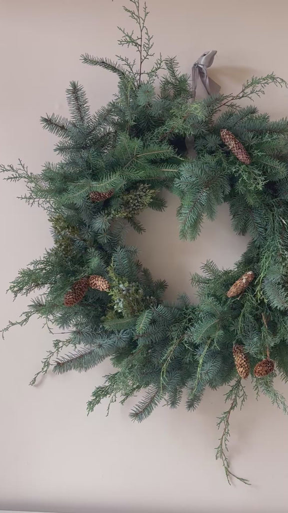 Designed onto a grapevine base filled with blue spruce, juniper, carolina sapphire cypress and pine cones. This wreath is a beautiful statement piece to decorate your door.